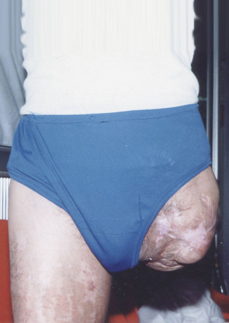 残肢长度约6cm,几乎与会阴 部平齐,前侧、内侧满是疤痕