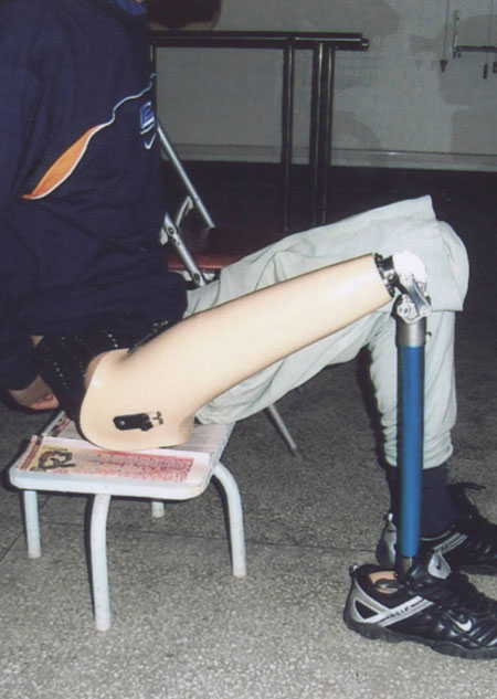 蹲坐低矮的小板凳,假肢也不脱落,站起身来就能健步行走。