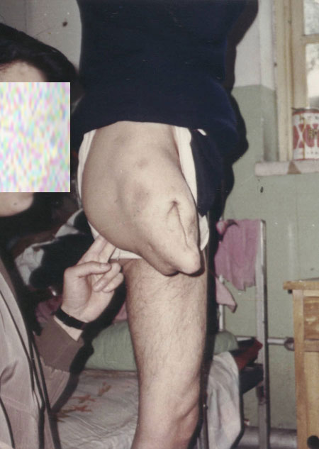 残肢长度10.5cm,圆锥形,以 前使用靠腰带悬吊的假肢,残肢与 假肢的活塞作用导致残肢与系腰带处 经常被磨破,影响穿戴假肢的效果。